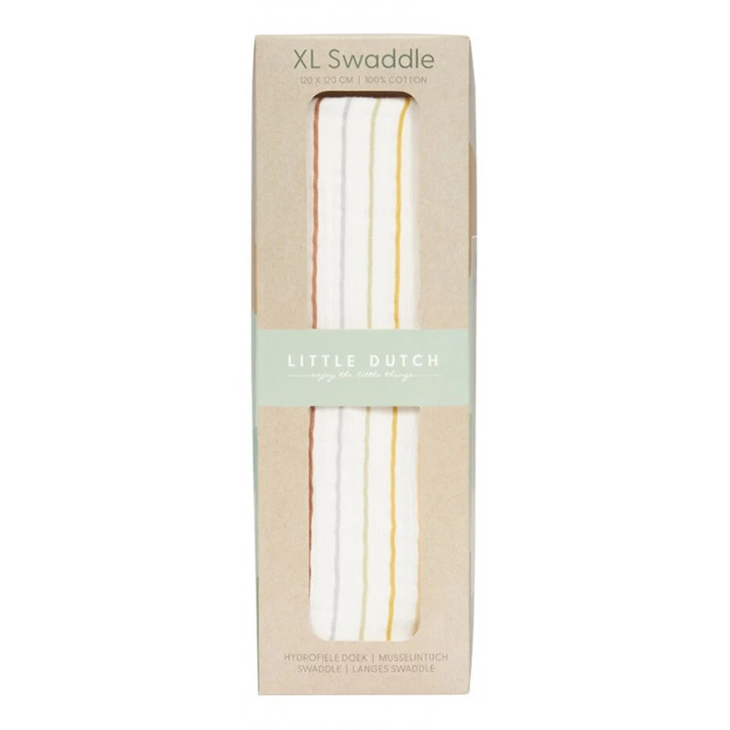 Ce maxi-lange Vintage Sunny Stripes de Little Dutch vous rendra tellement de service qu’il ne quittera plus l’univers de votre bébé ! Il mesure 120 x 120 cm, et sert à tout : à emmailloter votre nourrisson pour le rassurer, à lui créer un peu d’ombre ou à l’abriter du vent, à le couvrir légèrement en été, à le sécher après le bain, comme bavoir ou linge d’allaitement, en matelas à langer ou tapis de jeu d’appoint…