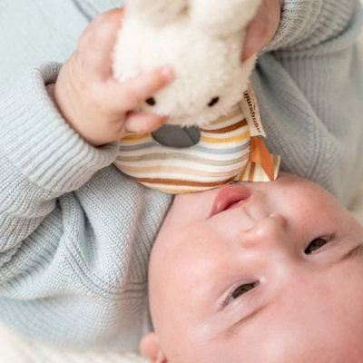 – Plusieurs textures et étiquettes à manipuler pour stimuler l’éveil sensoriel.
